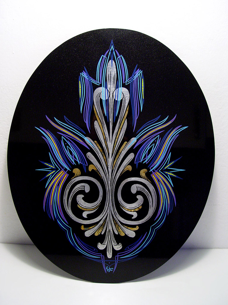 Lavorazione su vetro. Base nero metallizzato. Decorazione centrale in foglia argento/oro variegato blu. Pinstriping. 14 ore di lavoro.