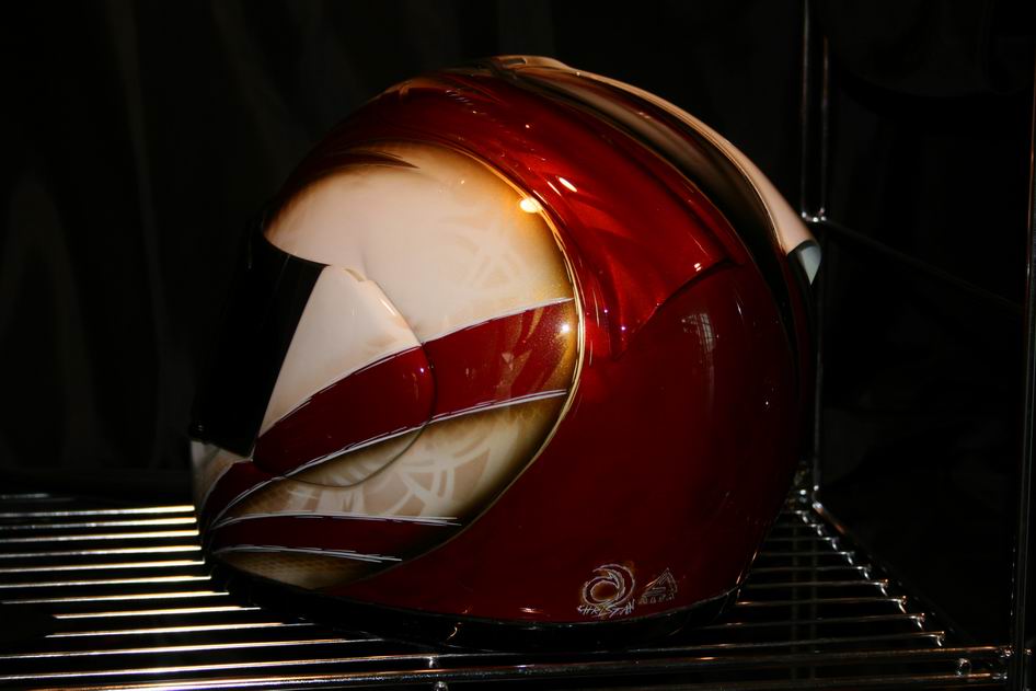 Arai. Alsa Candy blood red, mandarin orange, gold flake, pinstriping, graphics 3D