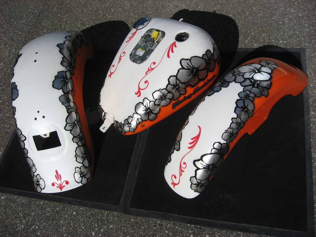 2008 custompaint & pinstripe real Harley-Davidson Dortmund bike fine 3 shades of metalflake flowers on pearl white & tangelo pearl orange with ice pearls gold