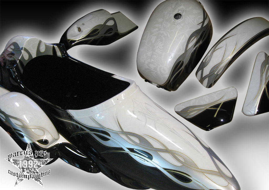 fine metalflake flames with ghostfloral combined with lightgrey pinstripe & black, paint for IWAN BIKES in germany for the IMOT exhibition