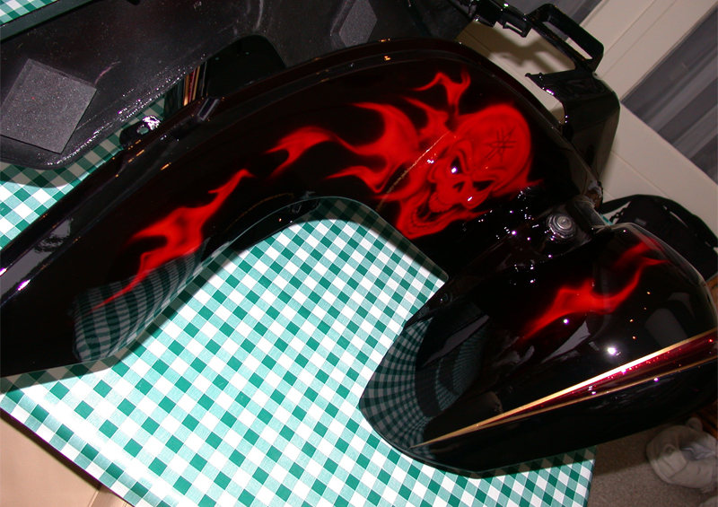 Yamaha raptor - black with red mini flakes and gold striping plus flames and skulls in apple red