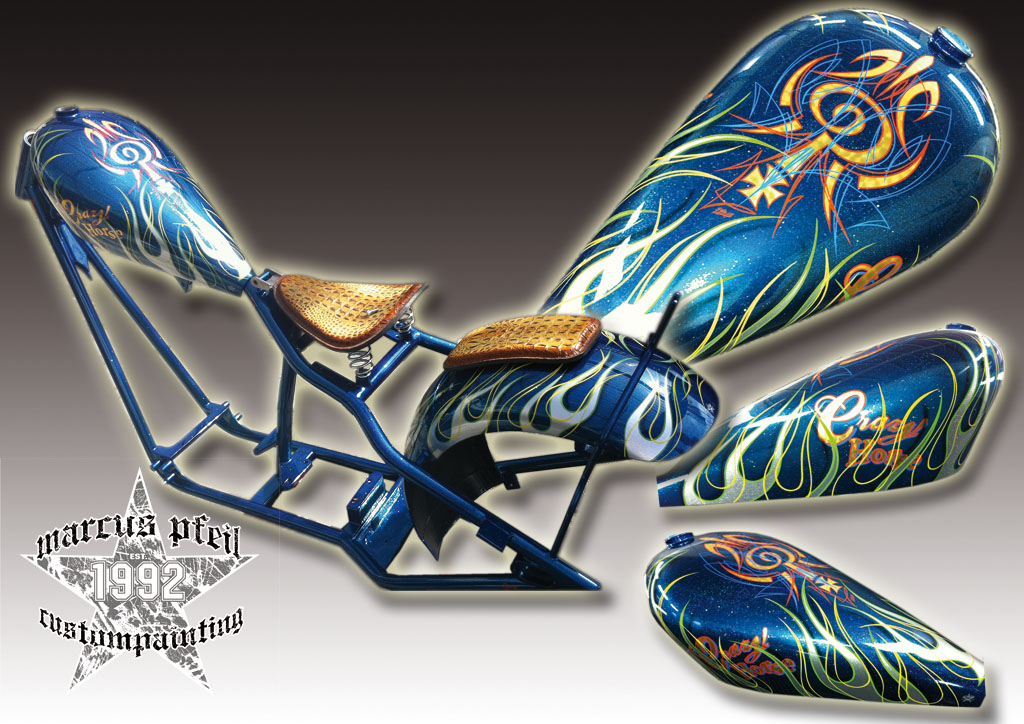 fine metalflake base with metalflake flames, twisted goldleaf & pinstripes