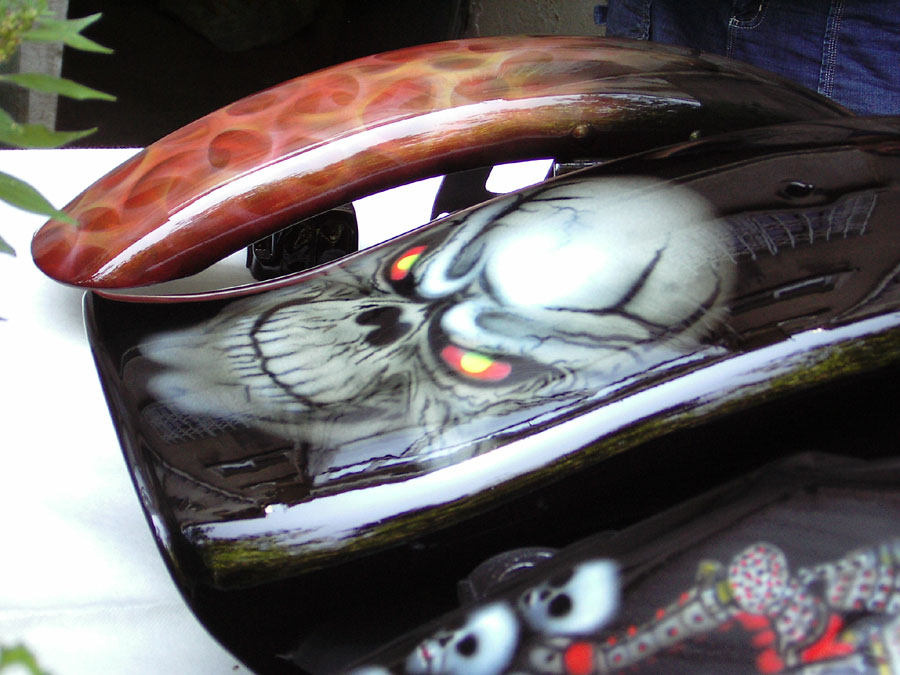 the back fender with a skull and the front one with flames before mounted back on the bike