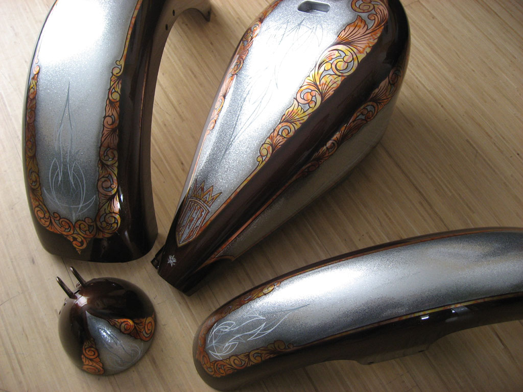 fine metalflake silver & brown base with goldleaf floraldesign & pinstripe