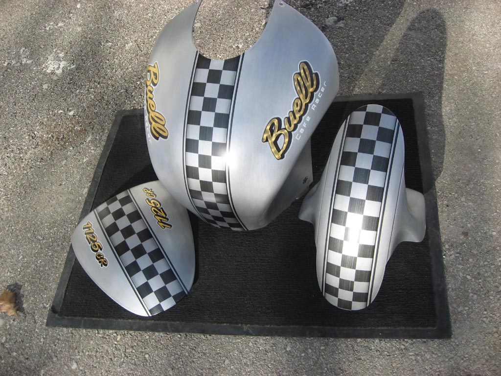 2009 custompaint & pinstripe real harley-davidaon europe buell fine cafe racer style checkerboard on immitated brushed aluminium basepaint with twistet goldleaf sign. this buell is the prototype for harley-davidson importeur in mörfelden for the new Buell 1125cr
