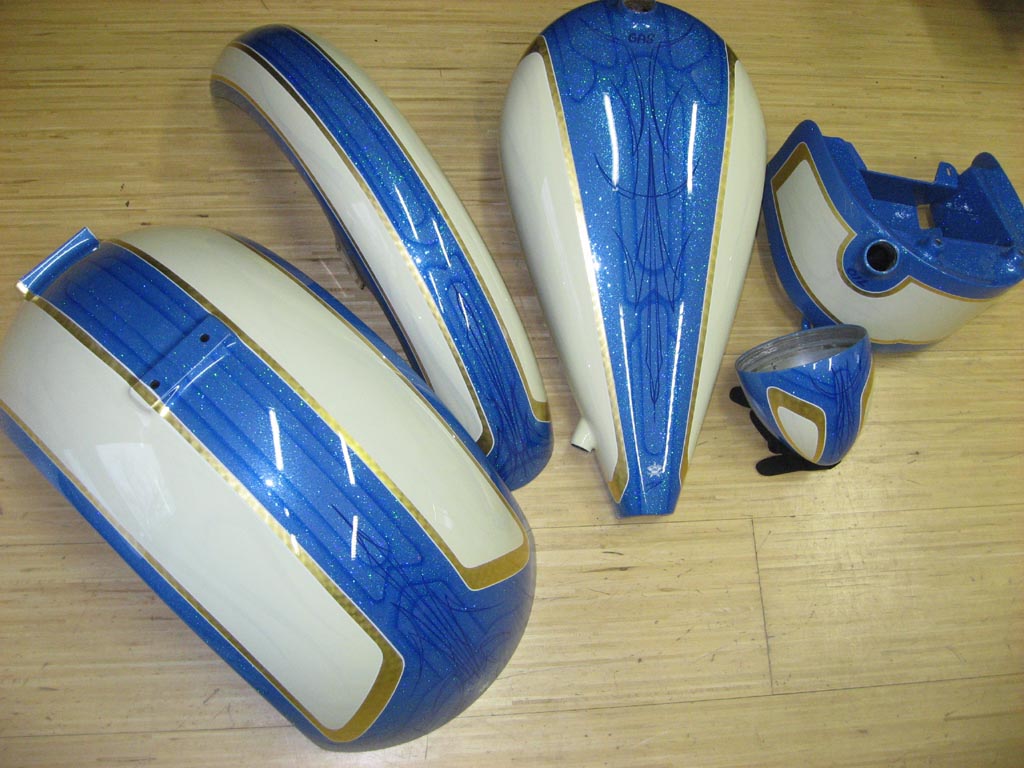 fine twistet goldleaf on lightblue metalflake with ghostflames on beige & pinstripe