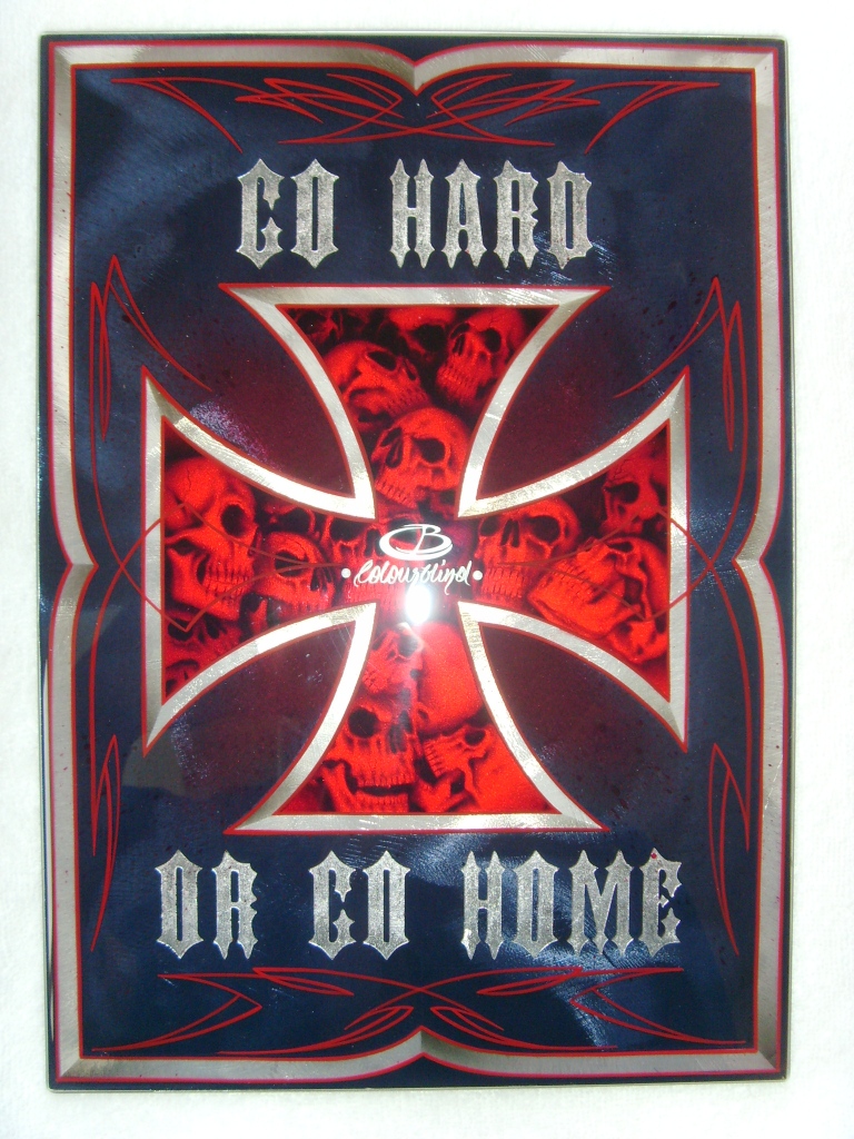 Ground metal sheet under darkblue candy, freehand skulls under deep red candy, some blood stains and freehand pinstripes, scratched silver leaf for the letters DIN A4