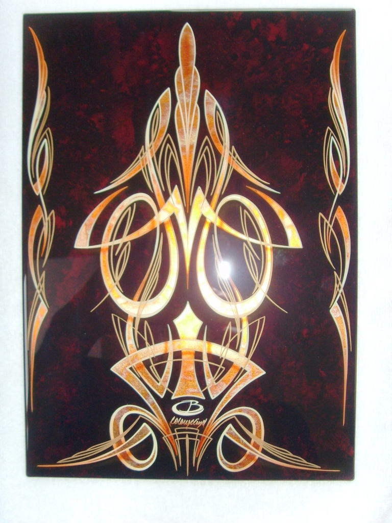 Precious burl wood FX under redbrown candy, red marbled gold leaf, freehand pinstripe DIN A4